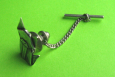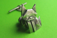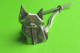 Its the classic Allegro origami cat, folded from sheets of .999 fine silver, and securely glued to a tie tack blank using epoxy. Each origami item is folded by hand, then kiln fired, lightly antiqued to bring out the detail, and polished.